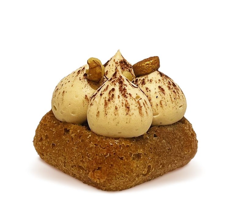 Beautifully baked choux bun with crackling to create extra crunchiness, filled with salted caramel chantilly, glazed with dark chocolate